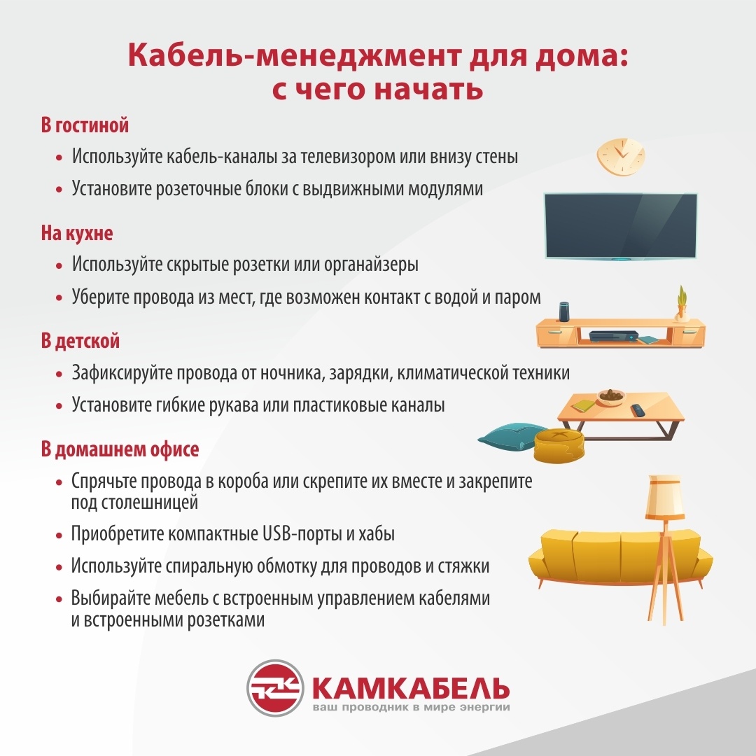 1) Определите, какие устройства будут подключены, где они будут располагаться. Проверьте длину проводов и их маршруты — это поможет понять, сколько кабелей потребуется и как их лучше всего разместить. Оцените «зоны хаоса»: 2) Уберите лишнее: отключите неиспользуемые приборы, обрежьте старые провода. 3) Купите базовые средства: Все это вы найдете в магазинах «Камкабель», а мы поможем подобрать решение под ваш интерьер и бюджет.