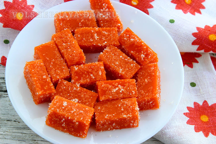 Если вы любите низкокалорийные сладости, обязательно попробуйте тыквенный мармелад. Десерт вкусный, а главное, натуральный, в отличие от многих магазинных, а значит, его можно смело давать детям. Приготовить домашний мармелад не сложнее, чем варенье. Потребуется спелая тыква, желательно десертного сорта. Отлично подойдет «мускатная» — она сама по себе сладкая и ароматная, поэтому из нее всегда получается вкусный мармелад, даже без добавления большого количества сахара. В качестве загустителя можно использовать желатин или агар-агар. Желирующие компоненты связывают состав мармелада, за счет чего он приобретает характерную плотность. Если хотите вкус, максимально приближенный к магазинному, то используйте агар (а еще лучше смесь пектина и агара в соотношении 50/50). Но у меня агара под рукой не оказалось, и я приготовила десерт на желатине. Общее время: 60 минут | Время приготовления: 35 минут