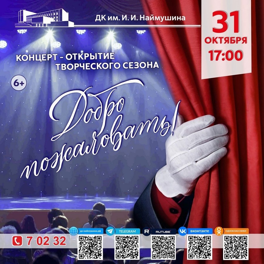 В 43 раз Дворец культуры имени И. И. Наймушина зажигает в Усть-Илимске маяк творчества! Новый сезон распахивает двери к новым созиданиям – от хореографии, ломающей законы гравитации, и театра – в огнях софитов, до вокала – в самое сердце. Этот праздник задаст ритм всему следующему году! Хочешь стать участником события, о котором будут говорить все? Добро пожаловать! Кроме того, не упусти возможность стать победителем розыгрыша призов от нашей творческой команды! Приходи 31 октября! Всё начнётся в 17:00! Билеты уже в продаже, в кассе Дворца культуры и на сайте, и они разлетаются быстрее, чем осенние листья! Справки по телефону: 8(39535)7-18-48. 6+