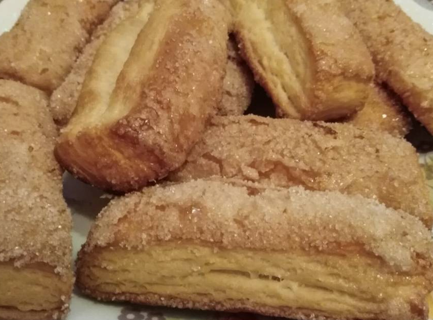 Ингредиенты: - 3 стакана муки - 1 стакан воды - 1 ч. л. соли - 1 яйцо - несколько капель лимонной кислоты - 250 г сливочного масла - сахар Приготовление: Замесить тесто. Раскатать небольшую лепешку, на нее положить сливочного масло, смешанное с 2 ст. л. муки. Завернуть тесто конвертиком и на 20 минут положить в холодильник. Затем тесто снова раскатать, только в одном направлении, снова сложить конвертиком и поставить в холодильник. Эту операцию повторить 2 раза. Тесто раскатать в пласт толщиной 1 см, вырезать из него прямоугольные лепешки. Каждую лепешку посыпать сахаром и слегка раскатать. На слегка смоченный водой противень уложить язычки и выпекать при температуре 260-280°C до готовности.