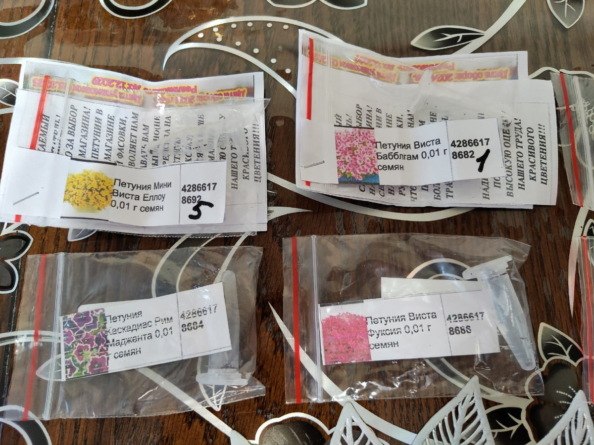 Друзья мои, всем здравствуйте! Огромное спасибо, что решили прочитать мою статью. Две недели назад, в одном из интернет магазинов заказывала семена Петунии и случайно наткнулась на продажу семян вегетативной петунии. Заинтересовалась т.к. думала, что вегетативные растения размножаются только черенками, семена они не дают или могут давать, но они не вызревают. В итоге я купила те сорта семян Петунии которые уже выращивала черенками. Вот что мне пришло: Семена очень мелкие, не в оболочке. Было очень сложно при посадке. Грунт для посадки использовала Терравита. Пролила его очень тёплой водой (только не перелейте!), сделала не глубокие бороздки и в каждую бороздку с помощью зубочистки посадила определённый сорт петунии. Землёй не присыпать, петуния сажается поверхностно! После чего, каждую бороздку, с помощью обычной пипетки, каплями, пролила стимулятором роста( на пол стакана воды 3 капли HB101). Закрыла контейнер и убрала на стеллаж с подсветкой. Температура на стеллаже +25 градусов.