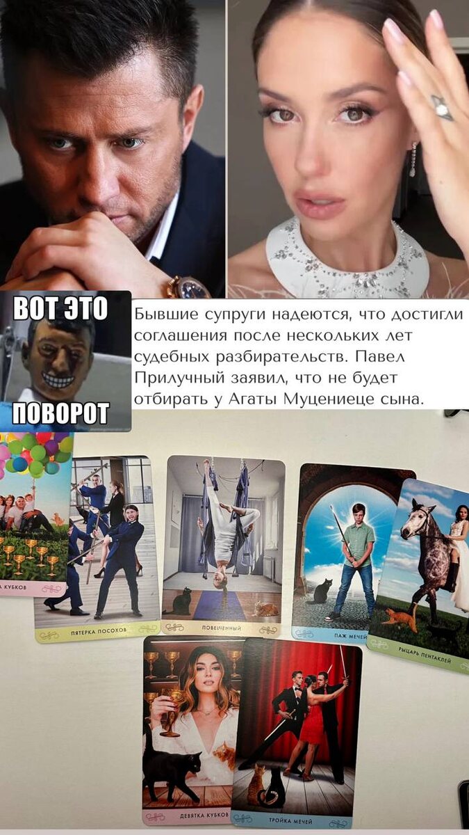 Внезапно🐶 после многолетней тяжбы битвызахрензнаетчто Прилучный решил, что пора завязывать и отдать ребенка матери. Чего это вдруг? Честно говоря, мне слабо верится, что конфликта нет, но карты и впрямь миролюбивые, возможно, алименты вторичны и теперь никто не требует денег (5 жезлов, 10 кубков). Однако проблемы в отношениях самих бывших, как были так и есть (Повешенные), аркан созависимости и общей ответственности 🤷♀️ общих детей растить и растить еще. И все же повторю вопрос: Павел действовал в интересах сына? Скорее потакал, ну и не пытался сгладить конфликт, а затягивал его (паж мечей, рыцарь пентаклей). Отношения между матерью и сыном разладились, кто как ни отец мог сказать что-то важное , чтобы «зарыть топор войны», но взаимные обиды бывших дело такое… нравилось бате, что сын выбирает его (9 кубков, 3 мечей). Но главное, что все закончилось хорошо или нет? Как считаете?