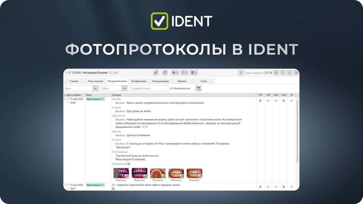 Фотопротоколы давно стали важным инструментом в стоматологии, помогая не только фиксировать этапы лечения, но и улучшать диагностику, контроль качества и коммуникацию с пациентами. Благодаря фотографиям «до» и «после» пациенты видят реальный результат и понимают необходимость лечения. Для врачей это удобно, а для главного врача — возможность следить за соблюдением стандартов и качеством работы команды. Чтобы упростить этот процесс, в IDENT 300 мы добавили собственную модель ИИ, которая поможет сделать работу с фотопротоколами быстрее и легче. В новую версию IDENT 300 мы добавили модель искусственного интеллекта, которая автоматически определяет тип изображения — фотопротокол, рентген-снимок или документ. Это значит, что врачам не нужно вручную сортировать и прикреплять изображения, всё делает ИИ. Снимки автоматически прикрепляются к приему, и их легко найти при заполнении карты пациента. Главный врач теперь может легко проверять, добавляют ли врачи необходимые фотопротоколы, что помо