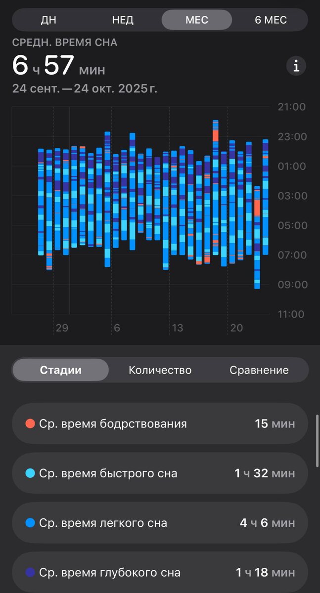 Почти месяц отслеживаю сон Интересно сопоставлять своё дневное состояние и качество сна Несколько выводов: • КАЧЕСТВО ≠ КОЛИЧЕСТВО Для меня оптимальное время сна — 7 часов. Когда больше, появляется отёчность и вялость. Меньше, суета и тревожность • ВАЖНО СОБЛЮДАТЬ ЗАДАННЫЙ РИТМ Если ложиться после 12, то сон менее крепкий и состояние фоновой тревожности • ПРЕНЕБРЕЖЕНИЕ КАЧЕСТВОМ СНА ИМЕЕТ НАКОПИТЕЛЬНЫЙ ЭФФЕКТ Сразу может быть незаметно и мне даже порой казалось, что можно спать по 4 часа без последствий. НО, наступает момент когда организм берёт свое и буквально вырубает тебя