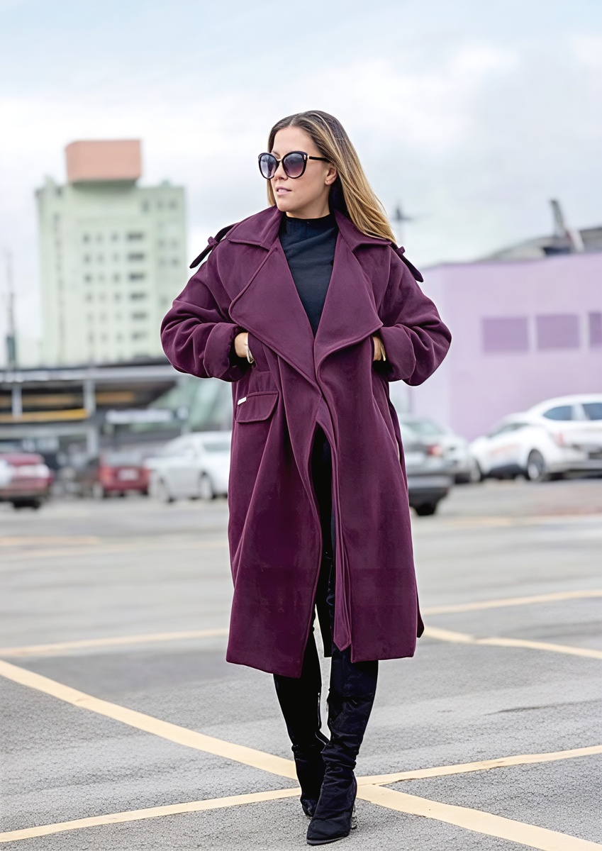 Сливовый оттенок работает почти как чёрный в плане универсальности, но добавляет образу глубины. Пальто этого цвета сочетается и с нейтральными базовыми вещами, и с другими насыщенными тонами. Лиловый хорош в трикотаже — водолазки и кардиганы в этом оттенке освежают лицо, создавая мягкий, но заметный акцент.