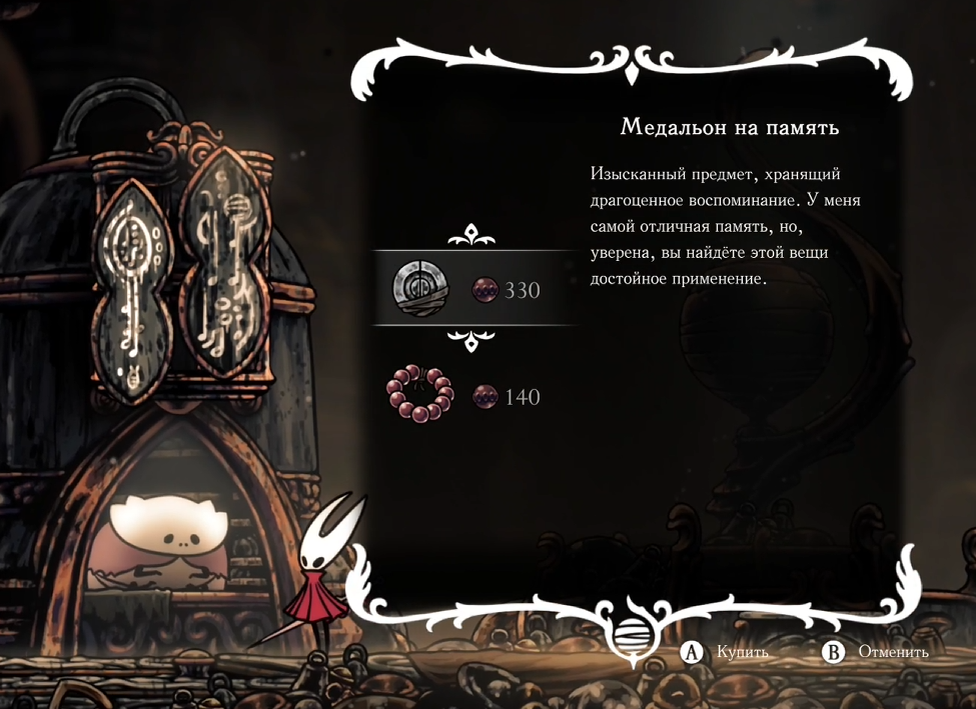 В этой зоне я нашел жуткий домик, обставленный свечками, — сцена как из хоррора. Оказалось, что это еще одна капелла — Капелла Странника, как ее представила игра. Изнутри она была переполнена ловушками. В конце была стандартная комната-ловушка, но не сложная, так как жуки в ней были все из первой зоны. За прохождение я получил новый знак, который пока не успел опробовать.