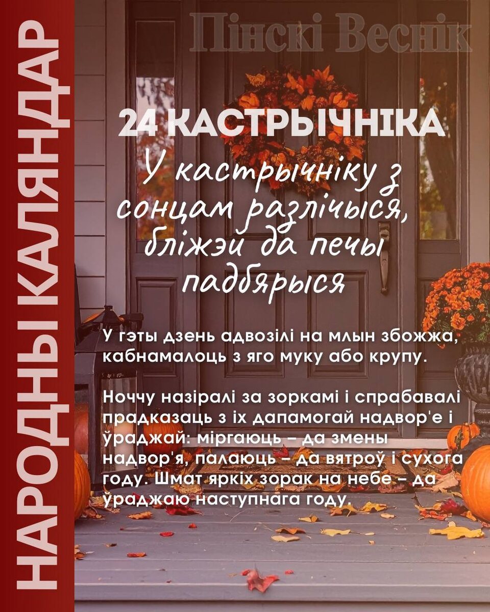 1️⃣1️⃣1️⃣1️⃣5️⃣1️⃣2️⃣ 1️⃣1️⃣1️⃣3️⃣1️⃣5️⃣1️⃣1️⃣ 📌24 КАСТРЫЧНІКА ✨У гэты дзень адвозілі на млын збожжа, кабнамалоць з яго муку або крупу. 🏷Ноччу назіралі за зоркамі і спрабавалі прадказаць з іх дапамогай надвор'е і ўраджай: міргаюць – да змены надвор'я, палаюць – да вятроў і сухога году. Шмат яркіх зорак на небе – да ўраджаю наступнага году. 📍📍@Пинский Вестник 📱ЮТУБ 📱САЙТ 📱ИНСТ 📱ВК 📱ОК 📱ФЕ 📱TikTok 📱Прислать новость