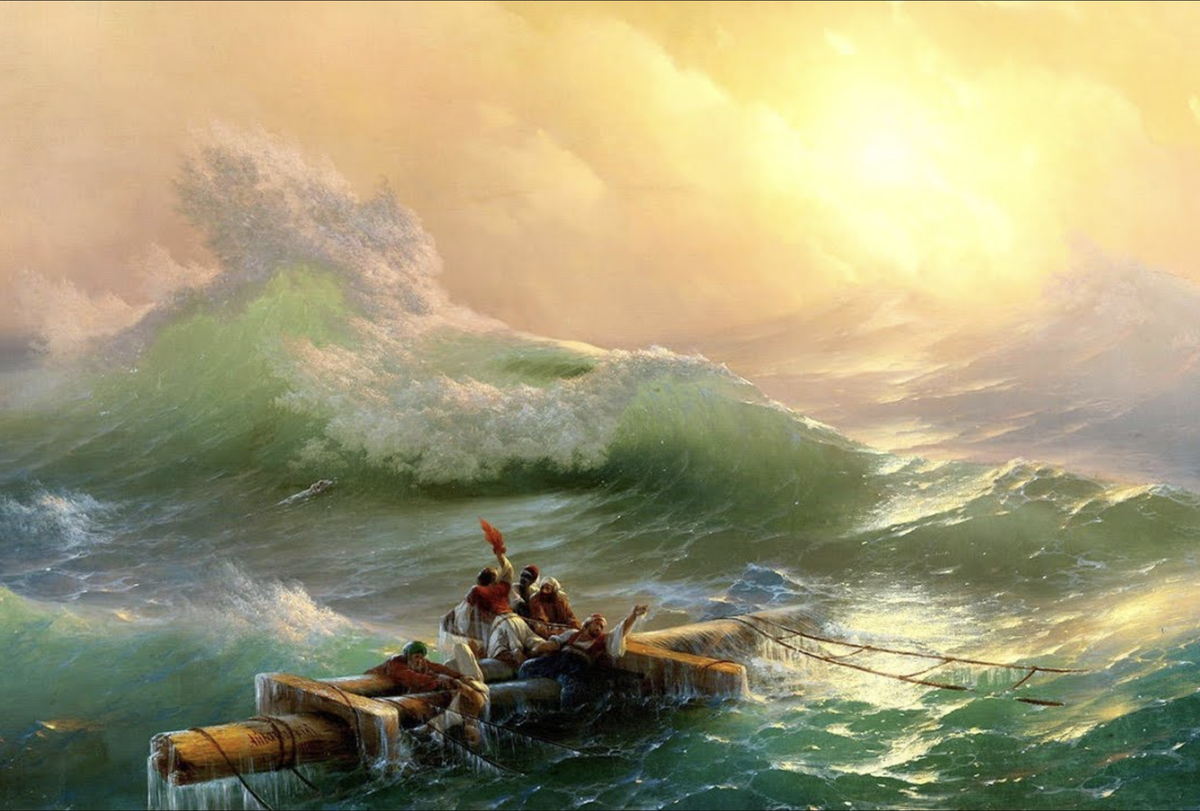Если физика волн у Айвазовского — это основа, то человеческий элемент превращает картину в драму. Фигуры на обломке объединены в треугольник надежды; их позы — не паника, а борьба, молитва и поддержка друг друга. Это превращение природного явления в нравственный тест — ключ к тому, почему картина трогает: мы видим не только воду, но и выбор, который делает человек перед лицом неминуемого.