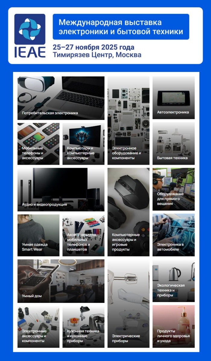25–27 ноября в Москве, в «Тимирязев Центре» пройдет выставка бытовой техники и электроники IEAE Вас ждут: ▪️более 370 производителей и поставщиков из Китая; ▪️десятки товарных категорий ▪️деловая программа с лидерами рынка — аналитика, тренды и реальные кейсы. Вы сможете: ▪️ первыми увидеть новинки и понять, что действительно востребовано на рынке; ▪️ лично пообщаться с ключевыми поставщиками и производителями; ▪️ договориться о сотрудничестве напрямую и заключить выгодные контракты; ▪️ лично проверить качество товаров на стендах. ☑️ Получите билет прямо сейчас! 📱 Подпишись #выставка