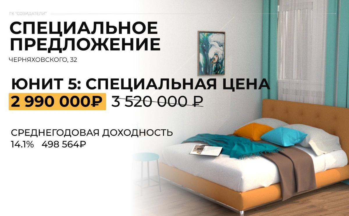 ❗❗❗❗❗Спецпредложение в апарт-отеле на Черняховского, 32! Последний юнит по акционной цене: Юнит №5 — 2 990 000 ₽ вместо 3 520 000 ₽ 📎Центр Петербурга, 4 минуты до м. «Лиговский пр-т» 📎Доходность — от 15 % годовых 📎Сдача — 4 Квартал 2025 года