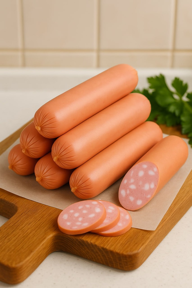 🥩Сосиски «Советские высшего сорта» (варёные) 👉Вам понадобится (на 1 кг готового фарша): •Говядина нежирная – 400 г •Свинина полужирная – 300 г •Телятина – 200 г •Шпик свиной (спинка, твёрдый) – 100 г •Лёд или ледяная вода – 120 г •Нитритная соль – 6 г •Соль поваренная – 10 г •Сахар – 3 г •Перец белый молотый – 1 г •Мускатный орех – 0.5 г •Коллагеновая оболочка Ø 24 мм – 3 м 🔪Готовим фарш: Мясо нарезаем кубиками и охлаждаем до −2 °C. Телячье и говяжье мясо прокручиваем через решётку 3–4 мм, свинину через 6 мм. Шпик нарезаем кубиком 3–4 мм, слегка подмораживаем. В куттере или мясорубке с насадкой соединяем мясо с нитритной и поваренной солью, сахаром и специями. Постепенно вводим лёд или ледяную воду для эмульгирования и сохранения температуры не выше +12 °C. В конце вмешиваем кубики шпика. Фарш охлаждаем в холодильнике 4–6 ч при +2...+4 °C. 👉Набиваем оболочку: Коллагеновую оболочку Ø 24 мм замачиваем, надеваем на шприц и набиваем плотно, без пустот. Формируем сосиски длиной по