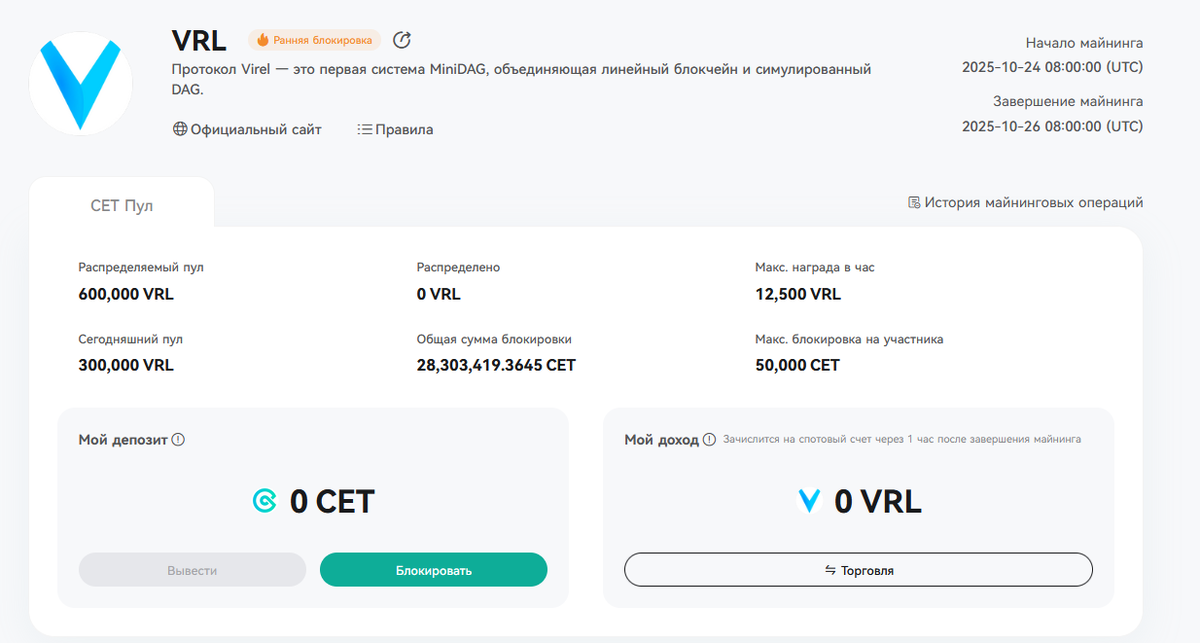 CoinEx Mining — это аналог Launchpool на Bybit, пользователи блокируют токены биржи $CET, а взамен получают новые монеты, которые только выходят на рынок. В данном случае — токен $VRL. Принять участие может каждый, кто прошёл базовую KYC-верификацию, а заблокированные монеты остаются под вашим контролем — их можно вывести в любой момент без штрафов. Майнинг VRL Биржа CoinEx проводит акцию «Заблокируйте CET и разделите 600 000 VRL».