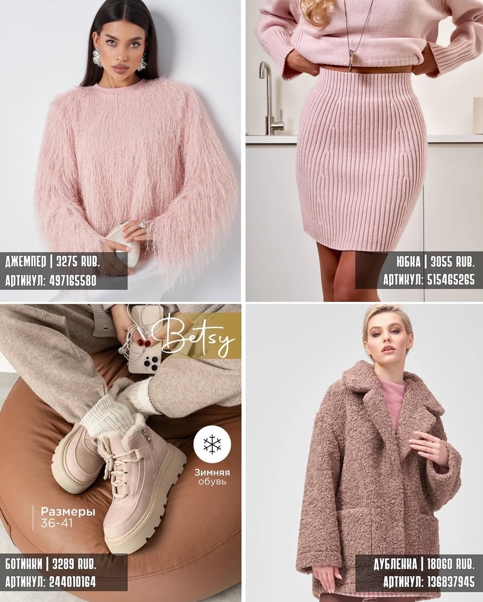 Эта подборка — про мягкие фактуры, женственные силуэты и тёплые оттенки, которые подсвечивают кожу даже в пасмурный день. Три коллажа складываются в цельный гардероб: нежная розовая линия, снежно-молочная база и глубокие кофейные акценты. Ниже — строго по порядку, как на фото, с артикулами, описанием каждой детали и советами стилиста.