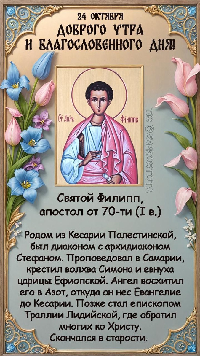 ✨✨✨ 💛 📅📅📅📅 ⛪️ Пятница 24 октября 2025 г. 11 октября 2025 г. (ст. ст.) Седмица 20 по Пятидесятнице; Глас 2 🌸🌸🌸🌸🌸🌸🌸🌸 🥗Растительная пища Память святых • Ап. Филиппа, единого от семи диаконов Собор святых Оптинских старцев: Льва, Макария, Амвросия, Моисея, Антония, Илариона, Исаака (первого), Анатолия (старшего), Иосифа, Варсонофия, Анатолия (младший), Нектария, Исаак (второго) и Никона Прп. Феофана Исповедника, творца канонов, еп. Никейского (ок. 850) Прп. Льва Оптинского (1841) Сщмчч. Филарета и Александра пресвитеров (1918) Сщмч. Иувеналия, еп. Рязанского (1937) Мцц. Зинаиды и Филониллы (I) Прп. Феофана, постника Печерского (XII)