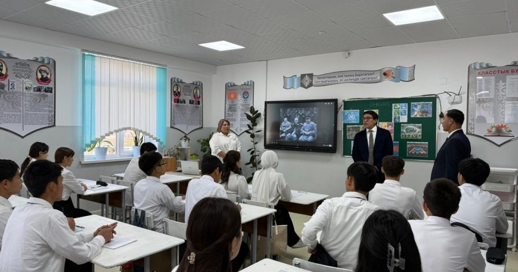 Кыргызстанда мектептерде БУУнун 80 жылдыгына арналган сабактар өткөрүлүп, окуучулар уюмдун тынчтыкты сактоодогу ролун жана Кыргызстандын кошкон салымын үйрөнүштү. 🎓 Кыргызстанда бардык мектептерде Бириккен Улуттар Уюмунун 80 жылдыгына арналган тематикалык сабактар жана иш-чаралар өтүүдө. 🌍 Окуучулар БУУнун тынчтыкты сактоодогу, эл аралык кызматташтыкты өнүктүрүүдөгү жана адам укуктарын коргоодогу ролун изилдөштү, ошондой эле Кыргызстандын уюмдагы салымы тууралуу маалымат алышты. 🏫 Бишкектеги Байдылда Сарногоев атындагы №100 орто мектебинде вице-премьер-министр Эдиль Байсалов жана Кыргызстандагы БУУ системасынын туруктуу координатору Антье Граве катышкан класстык саат болуп өттү. 📚 Бул иш-чаранын максаты – Кыргызстандын окуучулары БУУ тууралуу маалымат алып, өлкөбүздүн анын толук укуктуу мүчөсү экендиги менен сыймыктанышы керектигин түшүндүрүү. 🎨 Окуучулар иш-чаранын жүрүшүндө чыгармачыл иштерди, стенддерди жана БУУнун дүйнө жана жаштардын келечеги үчүн мааниси тууралуу кыска презе