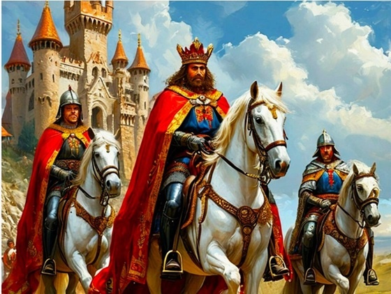 В таком облачении король ехал, опоясанный верным мечом с золотой рукоятью на шелковой перевязи и в ножнах, искусно отделанных по краям серебром; на голове у него была алая шапка с вышитыми руками опытных мастеров фигурками различных птиц и зверьков. В руке он держал жезл, и все его жесты выдавали превосходного воина, доставляя величайшее удовольствие всем, кто его видел»[9].