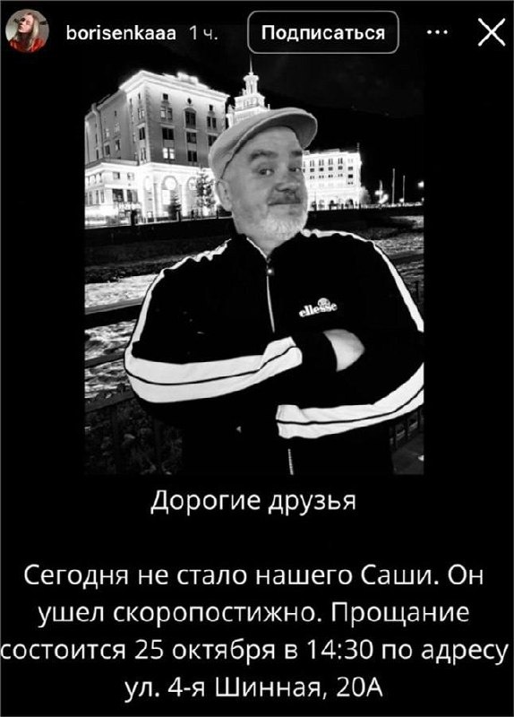 Скончался известный красноярский шоумен Александр Борисенко В ночь на 24 октября ушёл из жизни известный в Красноярске шоумен и ресторатор Александр Борисенко. О его смерти сообщили близкие и друзья. Причина пока не уточняется. Александр Борисенко долгие годы работал на телевидении и радио, вел и организовывал многочисленные развлекательные мероприятия. В последние годы он занимался бизнесом — был совладельцем сети кафетериев «Кекс и Крендель». Прощание с Александром Борисенко состоится 25 октября в 14:30 по адресу: ул. 4-я Шинная, 20а. 🤩Новости Сибири | Прислать новость