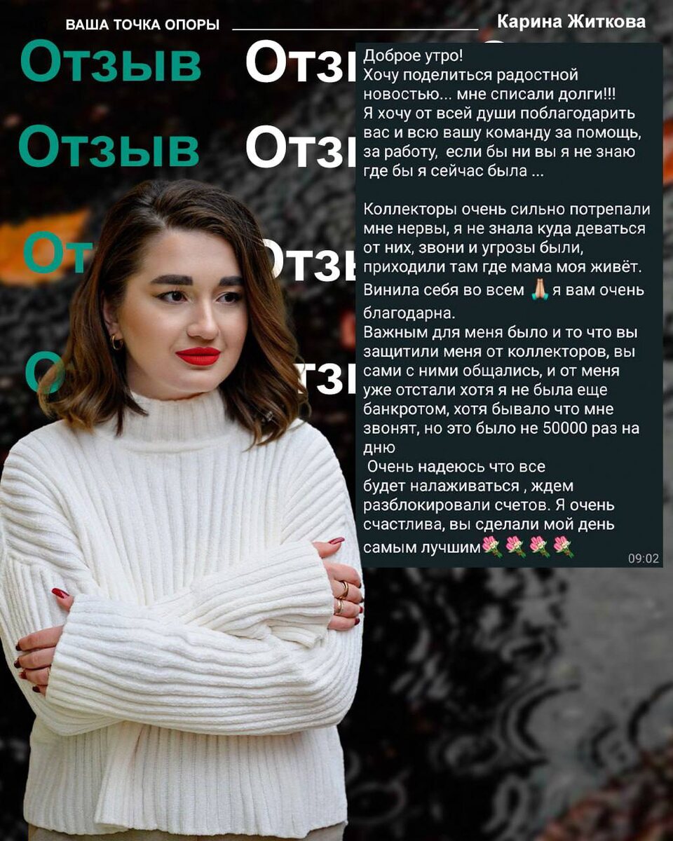 ⁉️Многим из нас кажется, что долг и стресс — это часть жизни, с которой нельзя избавиться. Но история нашей клиентки Людмилы — яркое подтверждение тому, что всё возможно, если есть желание и профессиональная помощь. Когда Людмила обратилась к нам, она была на грани отчаяния. Ее преследовали коллекторы, они постоянно звонили, угрожали, требовали деньги — это очень сильно потрепало ей нервы. В один из моментов она искренне сказала: "Коллекторы очень сильно потрепали мне нервы, я не знала, куда деваться от них…". Этот стресс и чувство безвыходности вынудили её искать пути выхода. И она нашла его — обратилась в нашу компанию. Мы взяли на себя всю работу по защите её интересов, разобрали её ситуацию, подготовили необходимую документацию и предприняли все меры для остановки давления коллекторских агентств. Наши юристы и эксперты по финансовому праву смогли качественно защитить Людмилу от угроз и давления, а также помочь ей начать процедуру списания долгов. Спустя время, благодаря нашей