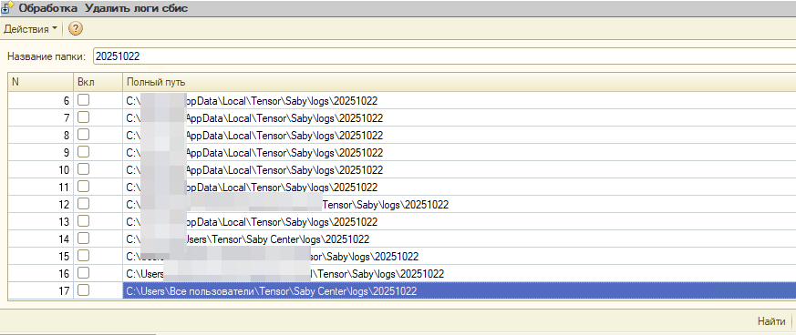 Сначала удалил все папки "20251022", на следующий день удалил папки "20251023" и папки "Tenzor", "Sbis3Plugin".