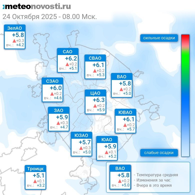 В 8:00 в Москве было от +5°C до +6.6°C, средняя температура +6°C #погода #Москва #осень #температура #24октября #пятница