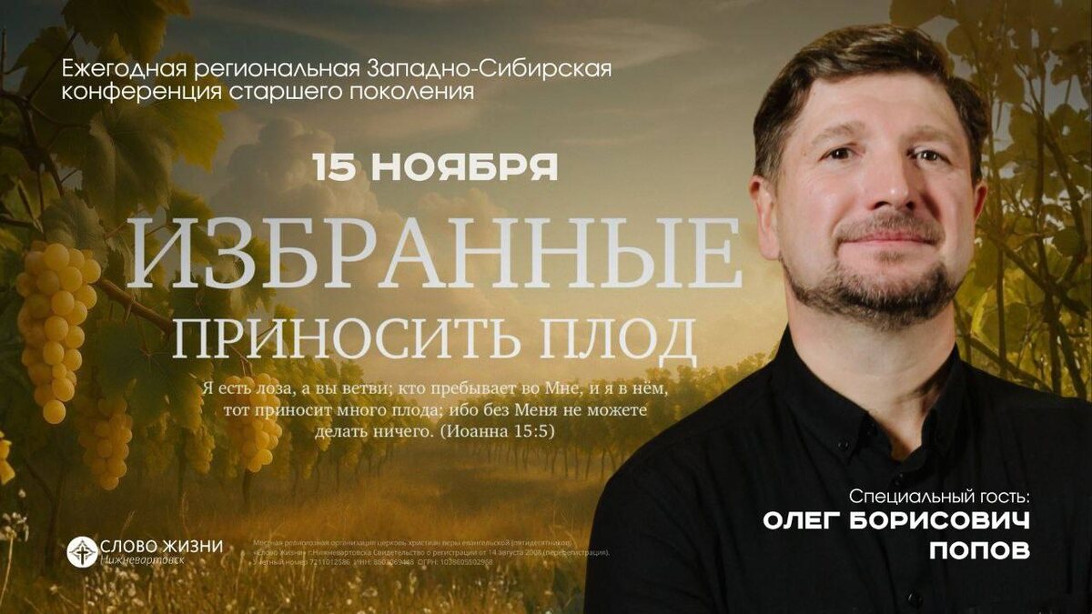 🌿 10-я Юбилейная Западно-Сибирская конференция старшего поколения «Избранные приносить плод» 🔠 Иоанна 15:5: «Я есмь лоза, а вы ветви; кто пребывает во Мне, и Я в нем, тот приносит много плода; ибо без Меня не можете делать ничего.» Это время вдохновения, благодарности и обновления в Божьем присутствии. Мы верим, что каждый из нас призван приносить плод — в вере, любви и служении независимо от возраста! 🔠 Специальный гость: Олег Борисович Попов — пастор, заместитель старшего пастора церкви «Слово Жизни», г. Москва. Пусть это юбилейное событие станет временем духовной силы, радости и единства! 🍇 🔠Ждем вас 15 НОЯБРЯ в Нижневартовске. Регистрация участников начнётся в 10:00. Зарегистрироваться и узнать более подробную информацию по конференции старшего поколения можно по телефону +7 982 135 54 52 — Наталья Якубова