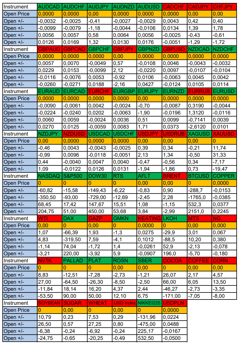 Весь перечень анализируемых активов указан ниже в общем количестве 62 инструмента. Здесь Вы найдете активы рынка Форекс, популярные активы Московской биржи, не менее популярные активы Чикагской биржи СМЕ и мажор криптовалютного сегмента - Биткоин, за которым следуют все альткоины.