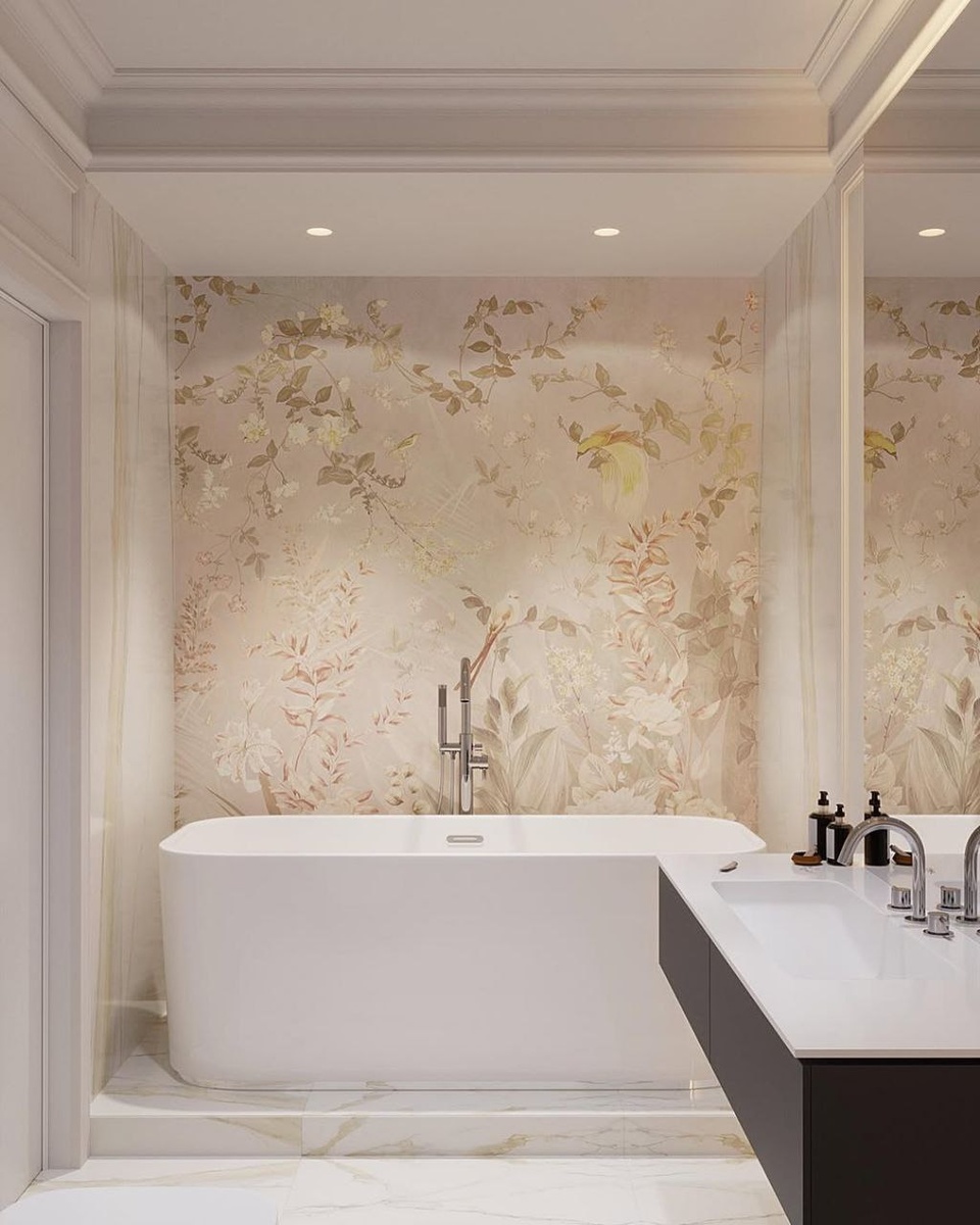 Фреска из коллекции #Exclusive@affrescoru (AB300-COL4) украсила ванную комнату. Автор проекта @dn_designstudio При помощи фресок и обоев в ванных комнатах можно создавать эксклюзивные авторские решения. Для изготовления фресок в мокрых зонах, в нашем ассортименте есть специальный влагостойкий материал - Sabbia. 🔸️Особенности материала Sabbia: ✔️Полотно дополнительно покрывается двусторонней гидроизоляшией ✔️Имеет плотный слой штукатурки со слегка шероховатой матовой фактурой ✔️Применятся в мокрых зонах. ✔️️Исключением являются лишь места постоянного прамого попадания воды: душевые и чаши бассейнов. 📌Советы по применению: 🔹️Перед монтажом поверхность обработать противогрибковым грунтом. 🔹️Прорези для сантехники обработать силиконовым герметиком, чтобы за полотно не попадала влага 🔹️Использовать усиленный клей на основе пва, поставляется в комплекте бесплатно. Использовать плинтус 🔹️Уход щадящими моющими средствами. - Посмотреть фрески, панно, обои и ткани можно в нашем интерне