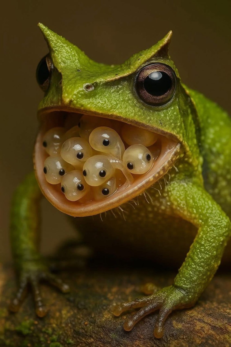 Открытая Чарльзом Дарвином в 1834 году во время экспедиции на HMS Beagle, Rhinoderma darwinii до сих пор остаётся одним из самых эксцентричных представителей земноводных. Размером всего 2–3 см, она выглядит как оживший лист — зелёный, коричневый, с треугольной головой и носом, достойным сказочного персонажа. Её чёрное брюхо с белыми пятнами — не просто стиль, а средство защиты: перевернувшись на спину, она превращается в «пятно на земле», сбивая хищников с толку. Но главное шоу начинается после кладки. Самец, не будучи ни акушером, ни кенгуру, проглатывает развивающиеся эмбрионы — не в желудок, а в голосовой мешок, который у него простирается от горла до паха. В течение 6–8 недель он живёт в молчании, не ест, не поёт, а внутри него развиваются головастики. Когда они готовы, он буквально «рожает» их через рот — один за другим, как фокусник, вытаскивающий лягушек из шляпы. Это явление называется неомелия, и оно уникально среди более чем 6 700 видов земноводных. К сожалению, этот чудо-о