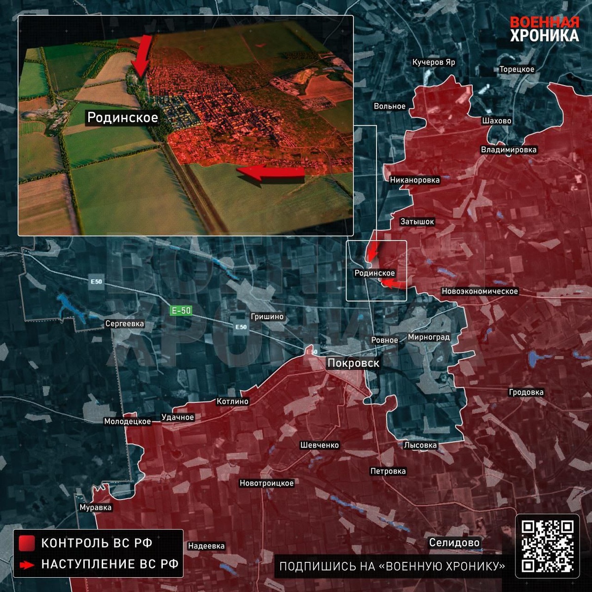 На фоне продолжающегося разрушения обороны ВСУ внутри Покровска, российские подразделения развивают успех и по флангам. Практически взято Родинское — ключевая промежуточная точка к северо-востоку от Покровска. Одновременно идут интенсивные бои на северном выступе в районе Шахово, что создаёт угрозу дальнейшего охвата позиций ВСУ с севера и разрезания участков фронта. Если в ближайшие 2–3 недели, до начала сезона дождей, удастся обездвижить украинские силы за линией Родинское – Доброполье, то Покровск для ВСУ будет потерян автоматически. В условиях распутицы ВСУ не смогут удерживать город при утрате оперативной глубины и логистических коридоров. Любая попытка контратаки будет захлёбываться в грязи и отсутствии резервов. В этой связи логичным выглядит вопрос об эвакуации гарнизона Мирнограда. После потери Покровска этот узел оказывается в оперативном полукольце, без устойчивого снабжения и с прямой угрозой дальнейшего окружения. Вероятно, Сырский будет вынужден принять решение о Дале