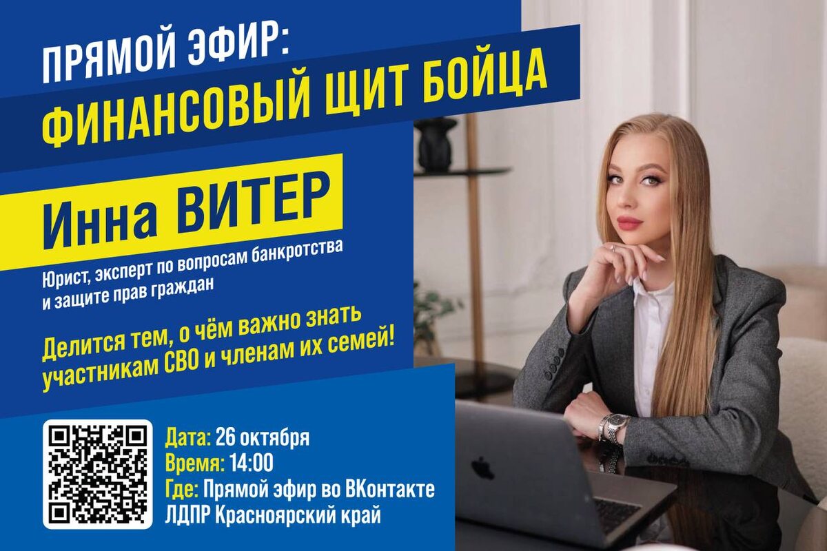 🎙 ПРЯМОЙ ЭФИР: ФИНАНСОВЫЙ ЩИТ БОЙЦА 💼 Инна Витер — юрист с многолетним опытом, эксперт по вопросам банкротства и защите прав граждан — делится тем, о чём важно знать участникам СВО и членам их семей. 📌 В программе эфира: – «Защита тыла»: как обезопасить деньги, находясь на расстоянии – «Знай свои права»: льготы, о которых нужно знать – «Деньги в дело»: грамотное распоряжение средствами – «Не рискуй напрасно»: основы безопасного приумножения средств 📅 Дата: 26 октября 🕒 Время: 14:00 📍 Где: Прямой эфир на странице ЛДПР Красноярский край во ВКонтакте 💬 Присоединяйтесь, задавайте вопросы в чате, проведем живой и полезный эфир!