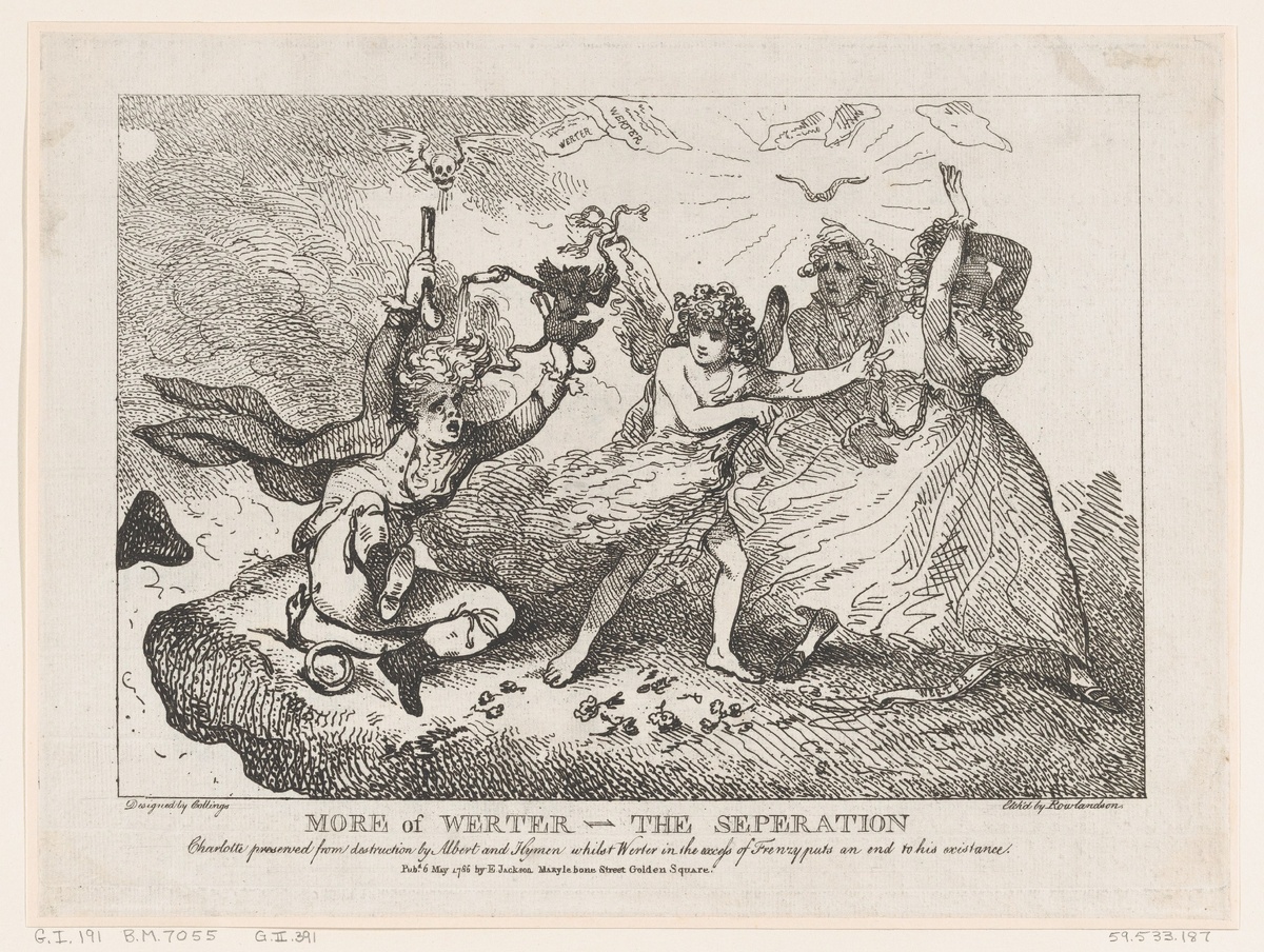 На этом впечатляющем гравюре от Томаса Роулендсона мы видим драматическую сцену, где герои «Страдания юного Вертера» сталкиваются с бездной. Шарлотта, словно величественный щит, защищается от безумия Верта, который в момент отчаяния решает покинуть этот мир. Эта работа, созданная в 1786 году, передает не только страсть, но и ту безнадёжность, в которой запечатлена душа романтизма. 🎨