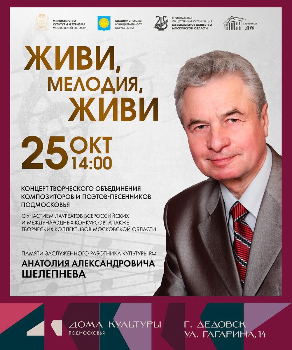 #афиша 🔊Приглашаем на концерт Творческого объединения композиторов и поэтов-песенников Подмосковья, проводимый при поддержке региональной организации «Музыкальное общество Московской области». 🎶Мероприятие посвящено памяти Заслуженного работника культуры РФ Анатолия Александровича Шелепнева. 💭 В программе — выступления лауреатов всероссийских и международных конкурсов и творческих коллективов Московской области. ⏰ Ждём вас 25 октября в 14:00 📍Дедовский Дом культуры Вход свободный!