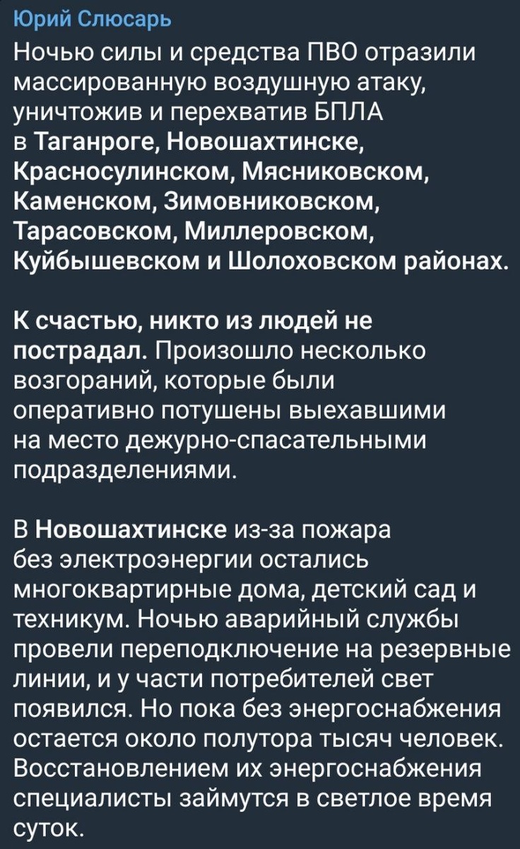 Ночью силы и средства ПВО отразили массированную воздушную атаку, уничтожив и перехватив БПЛА в Таганроге, Новошахтинске, Красносулинском, Мясниковском, Каменском, Зимовниковском, Тарасовском, Миллеровском, Куйбышевском и Шолоховском районах.