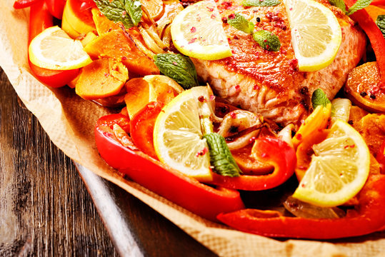 - Признак готовности: рыба плотная, но нежная; овощи мягкие с румяной корочкой.