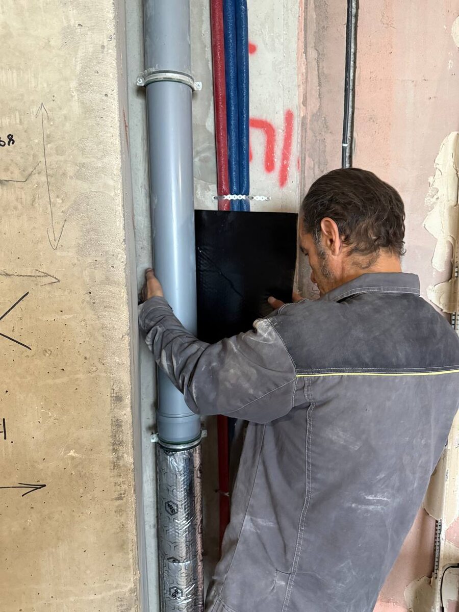 Оклейка канализационного стояка 110 мм шумоизоляционной мембраной. Звукоизоляция канализационного стояка.