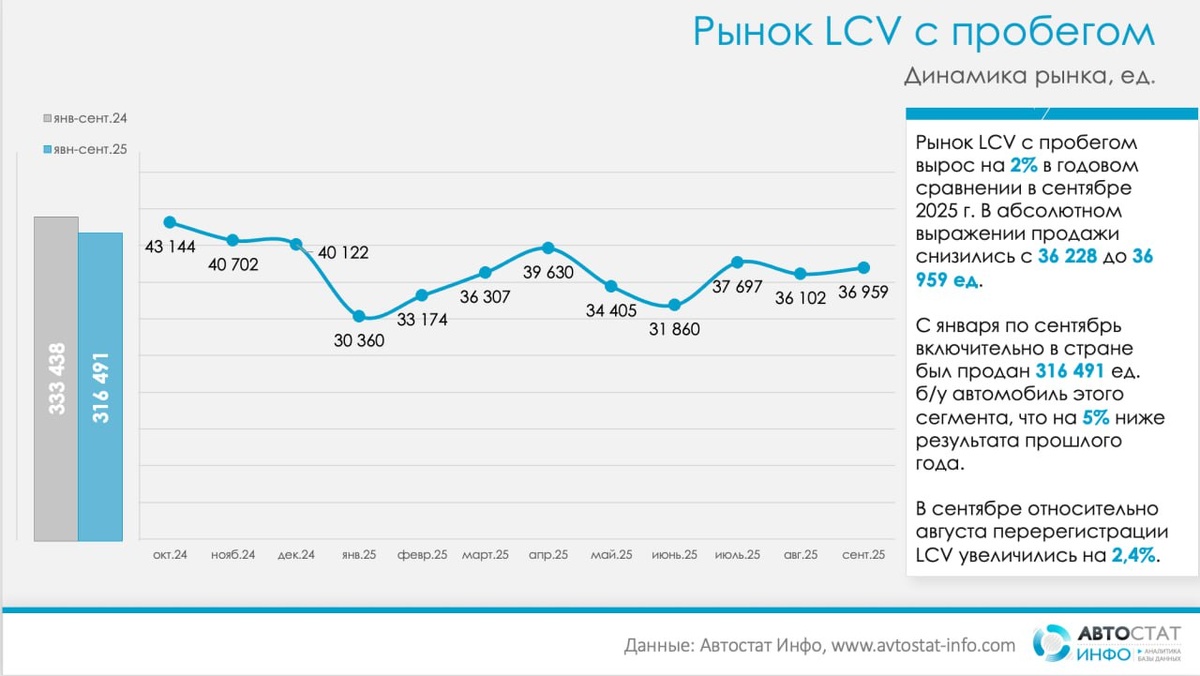 Подержанные LCV в сентябре: рынок нащупал «дно» и снова растет По данным «Автостат Инфо», в сентябре 2025 года в России перерегистрировано 36 959 подержанных легких коммерческих автомобилей (LCV). Это на 2,0% больше, чем год назад (36 228 ед.), и на 2,4% выше, чем в августе. За январь–сентябрь 2025 года рынок насчитывает уже 316 491 ед., что впрочем на 5% ниже уровня прошлого года (333 438 ед.). Иначе говоря, девятимесячный разрыв остается, но сентябрь показал явный разворот в плюс, компенсировав летнее охлаждение. Структурно рынок по-прежнему «российский»: с января по сентябрь доля отечественных марок составила 58% или 182 447 ед. (иностранных — 42% или 134 044 ед.). Географически прибавку тянут южные округа: в сентябре Южный ФО прибавил 14,9% г/г, Северо-Кавказский — 10,2%. Центральный, Приволжский, Северо-Западный и Сибирский округа просели в пределах от 0,3% до 5,0%, но сохраняют наибольшие доли парка: Центральный — 26,7%, Приволжский — 13,9%, Сибирский — 10,1%, Северо-Западный —