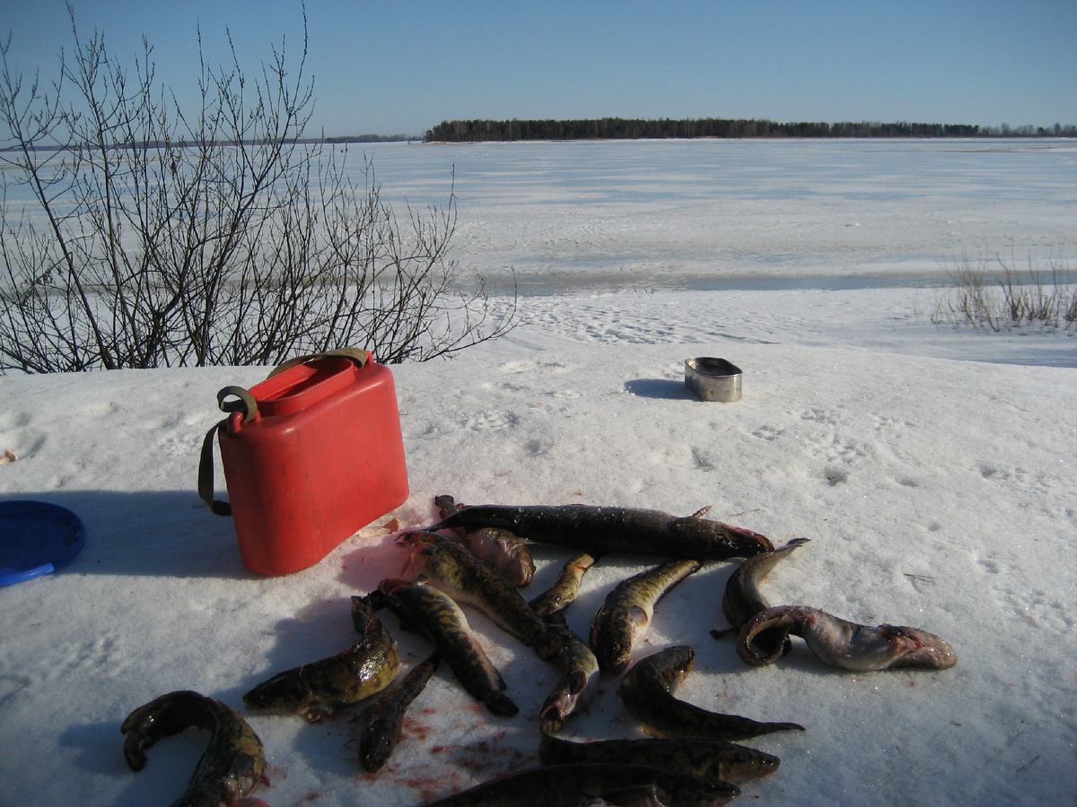 Так я впервые понял, что Подмосковные приманки, навыки ловли, здесь не очень то работают. И позднее, ещё долго привозил с собой живца,-ту же мелкую плотву, которую добывал в подмосковных прудах. Потом хранил живца в подвале в большом , наржавеющем кане, постоянно привозя и меняя в нём воду. К следующей поездке выживало не более 20-30 штук. Но этого вполне хватало на два-три дня ловли. А так как мы, впоследствии, подсмотрели у местных их ловлю налима со льда на клешки(подледные поставушки), то моя плотва работала по нескольку раз.