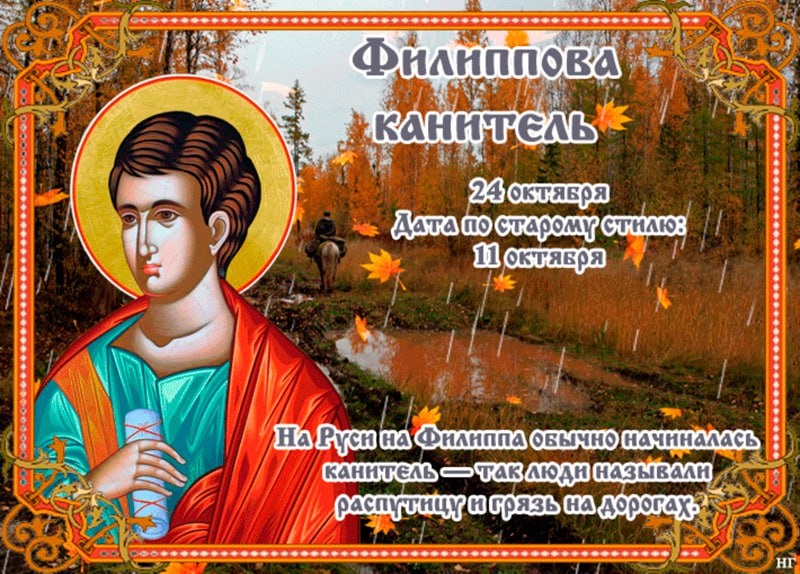 Народный календарь 24 октября В народном календаре этот день носит название Филиппова канитель. Такое имя он получил из-за погоды: к этому времени начиналась осенняя распутица, дожди со снегом превращали дороги в слякоть, затрудняя любое передвижение. Поэтому в дальний путь старались не отправляться. Наши предки считали, что сегодня нужно заниматься домашними делами, например, отвозить зерно на мельницу, чтобы перемолоть его в муку.
