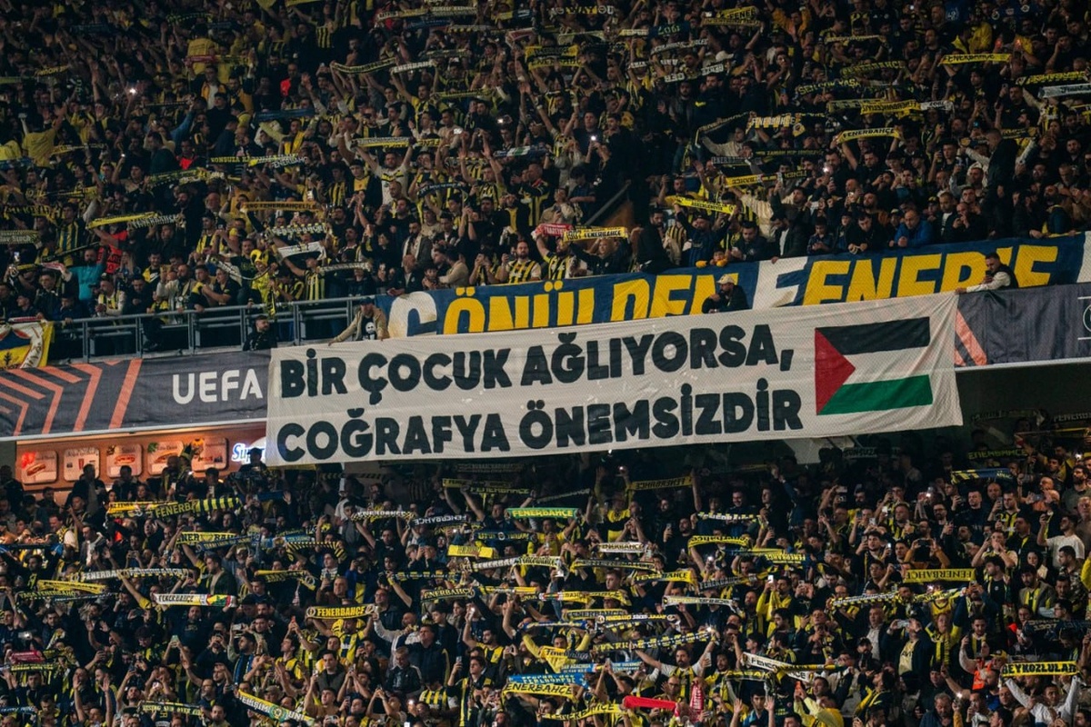 Фанаты «Фенербахче» поддержали Палестину в матче с «Штутгартом» Перед игрой 3-го тура Лиги Европы против «Штутгарта» (1:0) болельщики «Фенербахче» вывесили баннеры в поддержку Палестины. На трибунах появились надписи «Если ребенок плачет, география не имеет значения», «Свободу Палестине» и «Каждый ребенок в Палестине заслуживает безопасности, любви и будущего», сопровождавшиеся палестинскими флагами. ⚽️ Подписывайтесь на нас в MAX
