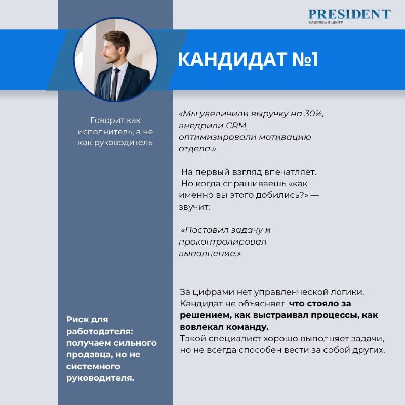 Разбор интервью: Кандидат на руководителя отдела продаж Иногда уже на первых минутах интервью становится ясно, насколько человек готов к управленческой роли. Сегодня — реальный кейс из практики PRESIDENT. Контекст: Компания искала руководителя отдела продаж (B2B, промышленное оборудование). В финал вышли два кандидата: оба с сильным опытом и хорошими цифрами. Разница проявилась только в диалоге. 👤Кандидат №1: Сразу перешёл к перечислению достижений: «Мы увеличили выручку на 30%, внедрили CRM, оптимизировали мотивацию отдела». Когда спросили, как именно он этого добился, ответ звучал общо: «Ну, я поставил задачу и проконтролировал выполнение». 📉Вывод: управленческая роль есть, но без глубины. Кандидат говорит как исполнитель, а не как лидер. Нет понимания, как работает система продаж и как он развивает людей. 👤Кандидат №2: Начал с анализа: «В отделе были проседания по холодным лидам — я пересмотрел воронку и перераспределил задачи. После внедрения CRM я провёл обучение, чтоб