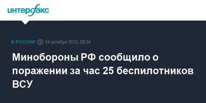 Минобороны РФ за час сбило 25 беспилотников ВСУ над Брянской, Тульской, Калужской, Тверской и Новгородской областями. Это произошло после ночной атаки, в ходе которой было уничтожено 111 воздушных целей.