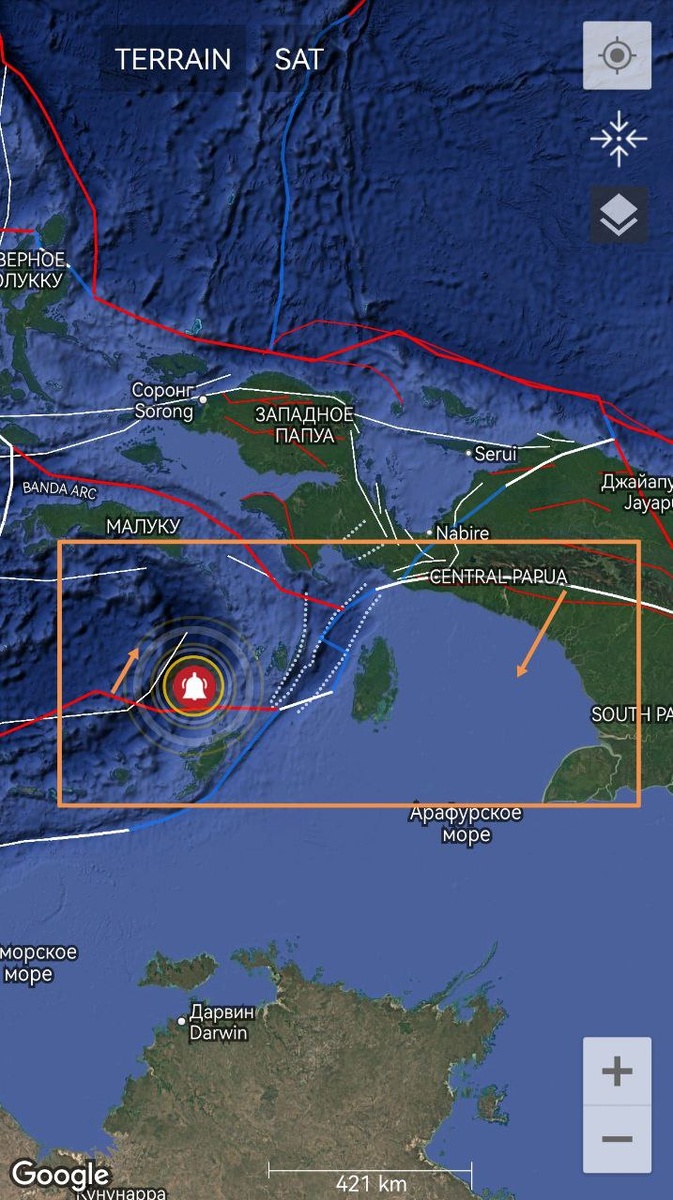 В зоне Арафурского моря и на юго-востоке моря Банда имеем очередной ОСТИ, дотягивающий до М7