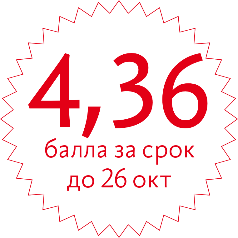 В Школах бюро очередной дедлайн для поступающих. После 26 октября стоимость обучения в Школах дизайнеров, редакторов и руководителей станет выше, а оценка за срок в конкурсе на бесплатное место — ниже. На первой ступени стоимость обучения повышается еженедельно до окончания набора. До воскресенья, 26 октября, стоимость обучения — 69 000, а не 76 000 ₽. В понедельник уже дороже. Доступны беспроцентная банковская рассрочка и простая оплата частями без банковских заморочек. Напоминаем, на первой ступени занятия идут круглый год. Для поступления достаточно оплатить первую ступень, а начать занятия можно в любой удобный день. Но планируйте начало занятий на первой ступени так, чтобы успеть на ближайшую вторую ступень — она проходит не чаще двух раз в год. Если вы не успеете закончить первую ступень к началу ближайшей второй ступени, то следующей придётся ждать ещё полгода. До 26 октября оценка за срок в конкурсе на бесплатное место в школе: 4,36. На следующей неделе оценка за срок уже ниже.