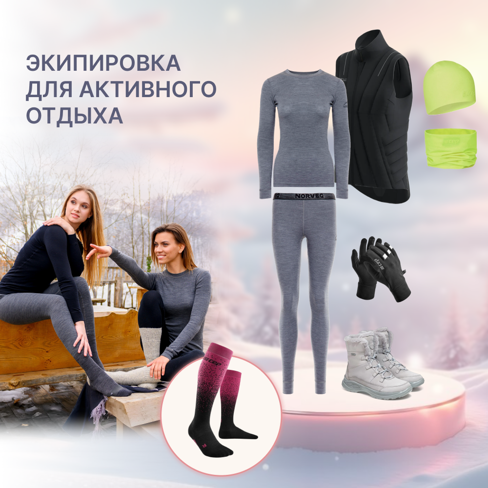 Холод – не повод оставаться дома. Именно с продуманной многослойной экипировки для активного отдыха начинается удовольствие от зимних прогулок. Подобрали для вас идеальное термобелье из теплой шерсти мерино, удобный тонкий жилет, бафф и шапку из практичного флис-бифлекса, компрессионные гольфы и теплые зимние ботинки на натуральном меху: надевать и гулять! ❄️Женская футболка Norveg Soft с длинным рукавом ❄️Леггинсы женские NORVEG Soft ❄️Компрессионные гольфы CEP для катания на горных лыжах ❄️Бафф CEP флис-бифлекс, унисекс ❄️Шапка CEP флис-бифлекс, унисекс ❄️Перчатки CEP для бега, унисекс ❄️Утепленный двусторонний жилет, CEP ❄️Женские зимние полусапоги Jomos из натурального нубука