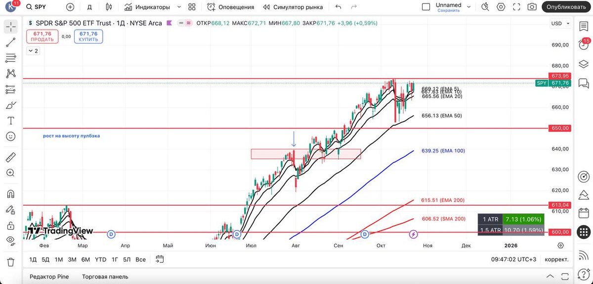 ВЫВОД: $SPY, $QQQ, $DIA, $SMH продолжают накапливать объемы около исторических максимумов + $VIX в моменте спускается ниже всех скользящих = выглядит довольно позитивно. Свеча-метка от 10 октября также может выступить сопротивлением, а такие сопротивления мы можем пробить на пре- и пост-маркете в момент низкой ликвидности. Поэтому не удивлюсь увидеть сквиз (особенно сегодня на данных ИПЦ). Либо продолжим формировать сетап на 10- и 20-EMA D. #spy #технический_анализ #америка #трейдинг_сша #фондовый_рынок #обзор #вывод #qqq #vix #smh #mags #xlk #ixic