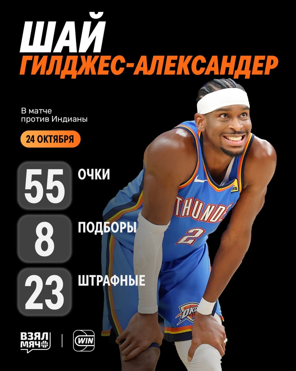 За 45 минут действующий MVP набрал 55 очков, реализовав 48% бросков. При этом Шай 26 раз бросал с линии в этой игре и 14 раз в прошлой. Так же на счету защитника 8 подборов и 5 передач.