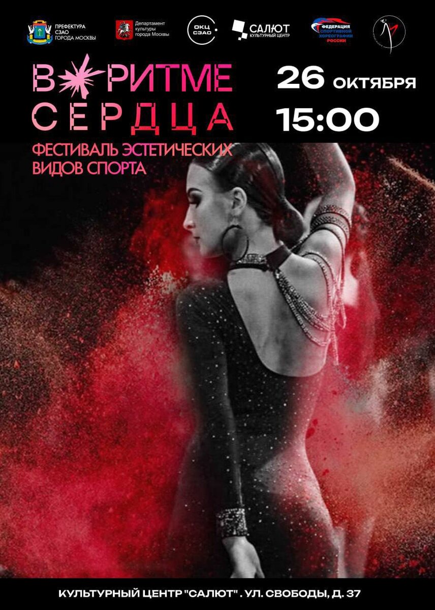 💖 Почувствуй ритм своего сердца! 26 октября в Культурном центре «Салют» состоится яркий фестиваль эстетических видов спорта — «В РИТМЕ СЕРДЦА» 📅 26 октября 📍 Культурный центр «Салют», ул. Свободы, д. 37 🕒 Начало в 15:00 Это событие объединит всё, что вдохновляет и наполняет энергией — движение, грацию, силу и красоту! В этот день зрителей и участников ждёт насыщенная программа, встречи с профессионалами, мастер-классы и, конечно, незабываемый гала-концерт! 🎯 ПРОГРАММА ФЕСТИВАЛЯ 🕒 15:00 — Мастер-класс по Художественной гимнастике Ведущая — Кристина Радикевич, мастер спорта, чемпионка Москвы и международных турниров 📍 Зал «Буран» 🕒 15:00 — Мастер-класс Мажорет-спорту (секция «Батон») Ведущая — Лилия Быкова, заслуженный работник культуры Московской области, судья международной категории 📍 Зал «Алмаз» 🕓 16:00 — Мастер-класс по Спортивным-бальным танцам Ведущие — Сергей Рожков, четырёхкратный чемпион мира по 10 танцам, и Елизавета Козлова, призёр международных турниров 📍 За