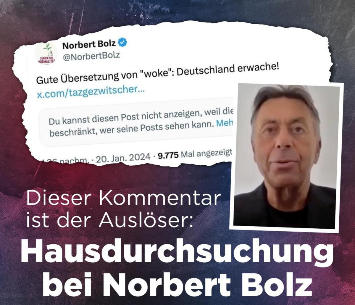 Плохой сюрприз утром для консервативного комментатора Die Welt профессора Норберта Болца: из-за комментария на платформе X полиция явилась к нему с обыском сегодня в 08:52 Норберт Болц 20 января 2024 года отреагировал на статью в taz следующим ироничным комментарием: «Хороший перевод слова woke: Германия, проснись!» (Deutschland erwache!) Для районного суда Тиргартена нашлось достаточно поводов, чтобы разрешить обыск на основании параграфа 86a Уголовного кодекса спустя 21 месяц (!) после публикации комментария. Болцу предъявляют обвинение в использовании символики антиконституционных организаций. Дело в том, что woke — «проснувшиеся» — сказать можно, а «Германия, проснись» — нельзя, так как, оказывается, Deutschland erwache! — это лозунг SA. Ну кто виноват, что лозунги леваков настолько близки лозунгам нацистов? Аналогично случаю с Бьорном Хёке, который из-за того же обвинения — использования лозунга SA — был привлечён к ответственности и признан виновным. Норберт Болц недавно проком