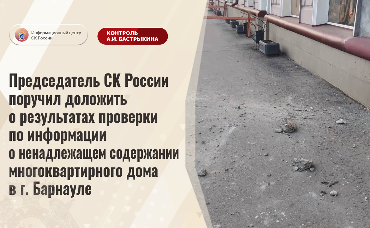 Председатель СК России поручил доложить о результатах проверки по информации о ненадлежащем содержании многоквартирного дома в г. Барнауле В социальной сети сообщается о ненадлежащем содержании многоквартирного дома на проспекте Ленина в городе Барнауле Алтайского края, являющегося памятником градостроительства и архитектуры регионального значения. Фасад здания 1954 года постройки разрушается, его бетонные фрагменты падают на пешеходную зону, что может привести к травмированию граждан. Отмечается, что мер к проведению ремонтных работ не принимается. В СУ СК России по Алтайскому краю по данному факту организована процессуальная проверка. Председатель Следственного комитета Российской Федерации Александр Иванович Бастрыкин поручил руководителю СУ СК России по Алтайскому краю Игорю Владимировичу Колесниченко доложить о ходе и результатах процессуальной проверки. Исполнение поручения, а также ход процессуальной проверки поставлены на контроль в центральном аппарате ведомства. #Следственный