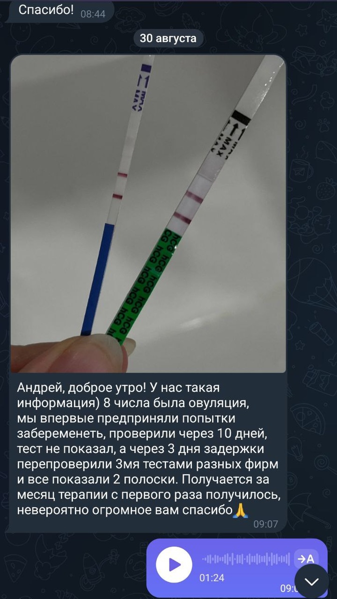 Приятные сообщения от пациентов! Ещё один случай лечения бесплодия... Что было ДО: * 2% нормальных сперматозоидов, а нужно 4 и более... * Низковатый тестостерон... * Беременность не наступала... Беременность наступила быстрее планируемого периода, но решили продолжать терапию, чтобы сделать контроль по анализам и увидеть результаты. Что стало ПОСЛЕ: * 5% нормальных форм сперматозоидов. Увеличение концентрации и общего количества сперматозоидов. * Улучшение самочувствия... * Значительное увеличение тестостерона. На сегодняшний день беременность протекает ок, сам мужчина чувствует себя тоже хорошо.